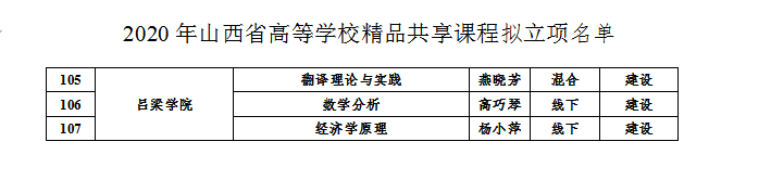 近日,山西省教育厅公布了《山西省教育厅关于公示2020年山西省教学质量提升工程各类项目拟立项项目的通知》(晋教高函〔2020〕36号),我系燕晓芳主持的翻译理论与实践课程获得立项。