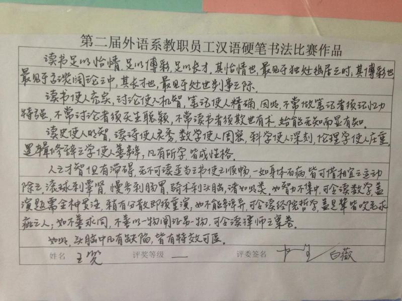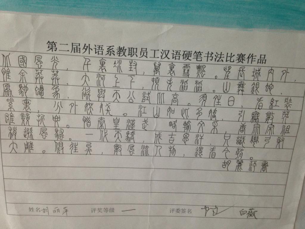 tyc86太阳集团第二届教职工汉、英语硬笔书法比赛圆满成功,本次比赛全系所有教职工踊跃参加,经过认真的评选,共有44份作品获奖,并将优秀作品进行展览。