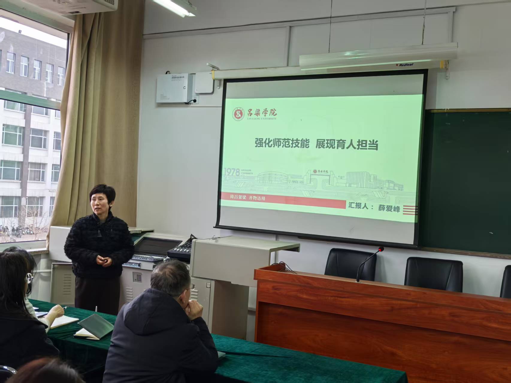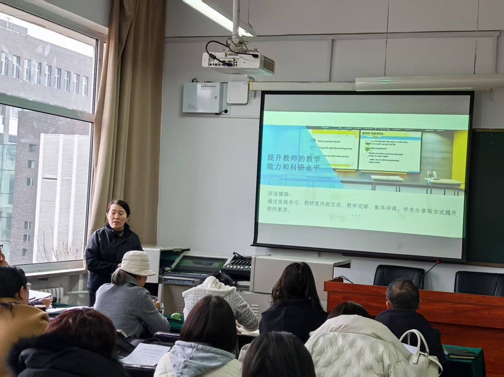 随后,各教研室主任聚焦教学改革,汇报了阶段性成果与未来计划。基础英语教研室主任张敏分享了通过组织演讲比赛、跨文化竞赛提升学生综合能力的实践;高级英语教研室主任燕晓芳总结近年教研室的教学经验,提出一系列举措提升教师的教学科研能力;教师教育教研室主任张智回顾了近年来师范生能力提升所获的成果,表示未来将强化师范生技能实训,通过实习见习观摩优秀教学视频提升实战能力。大学英语教研室主任孔晓霞介绍了大学英语课程教学改革成果,表示将继续完善大学英语课程考核体系,针对不同基础学生定制学习方案。