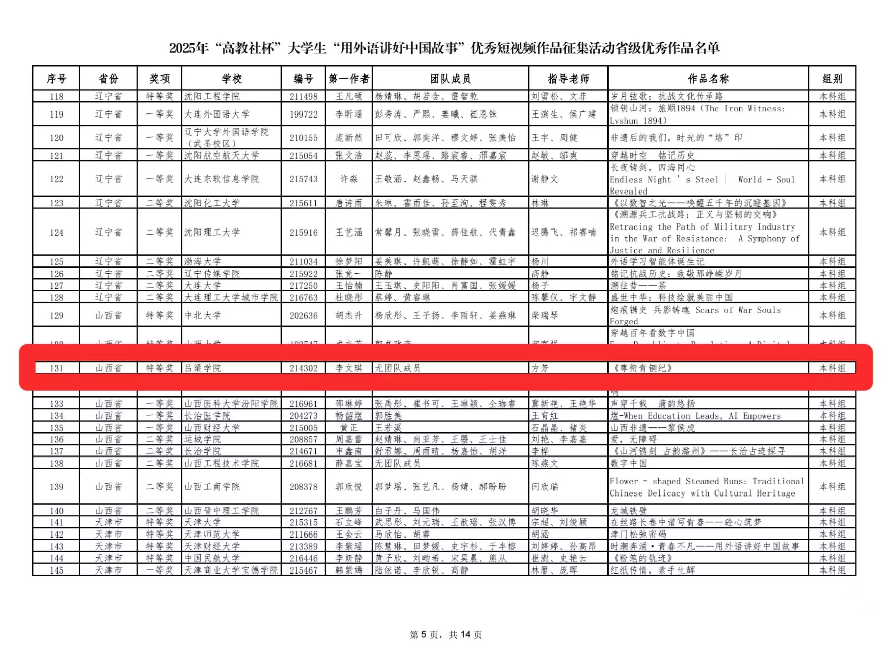 近日,2025年“高教社杯”大学生“用外语讲好中国故事”优秀短视频作品征集活动省级评选结果正式揭晓,tyc86太阳集团学子李文琪在方芳老师的悉心指导下,凭借作品《尊衔青铜纪》,从众多参赛作品中脱颖而出,荣获山西省特等奖。