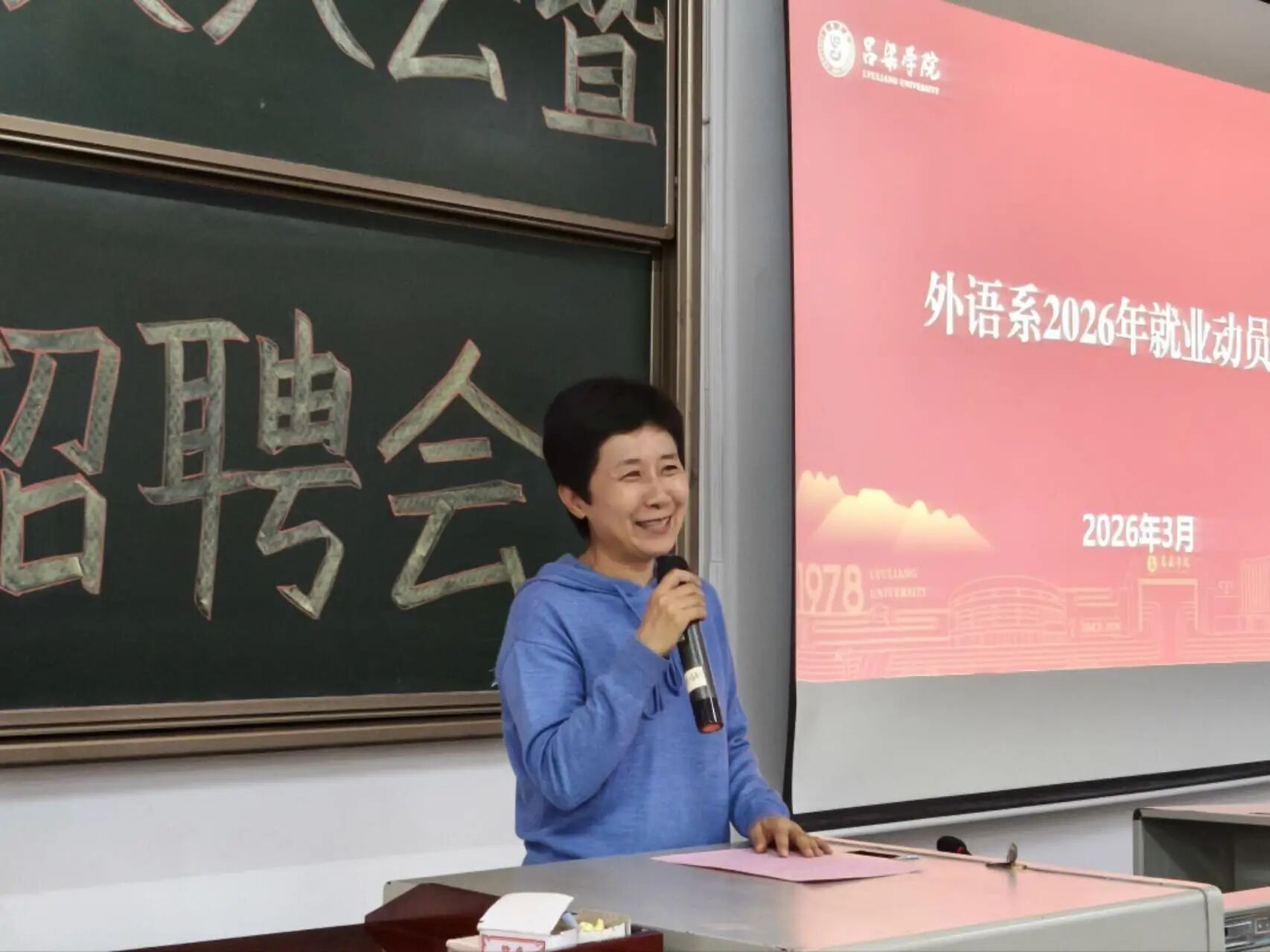 大会伊始,薛爱峰主任以外语人的自信与远方为开篇,为同学们筑牢职业信心。她语重心长地说道:“作为外语人,要把腰杆挺直,让自身的光芒照亮前行之路,永远不要怀疑自己的价值。”针对当下部分同学存在的“外语无用论”焦虑。薛主任强调,英语作为世界通用语言,是连接全球的核心纽带,在国际交流、文化传播、跨境商务等领域始终具备不可替代的优势。她鼓励同学们摒弃内耗与犹豫,主动走出舒适区,积极抢抓就业机遇,用行动打破迷茫。最后,她郑重承诺:“tyc86太阳集团永远是你们的大后方,我们都会为大家提供专业指导与资源支持,做你们最坚实的后盾。”