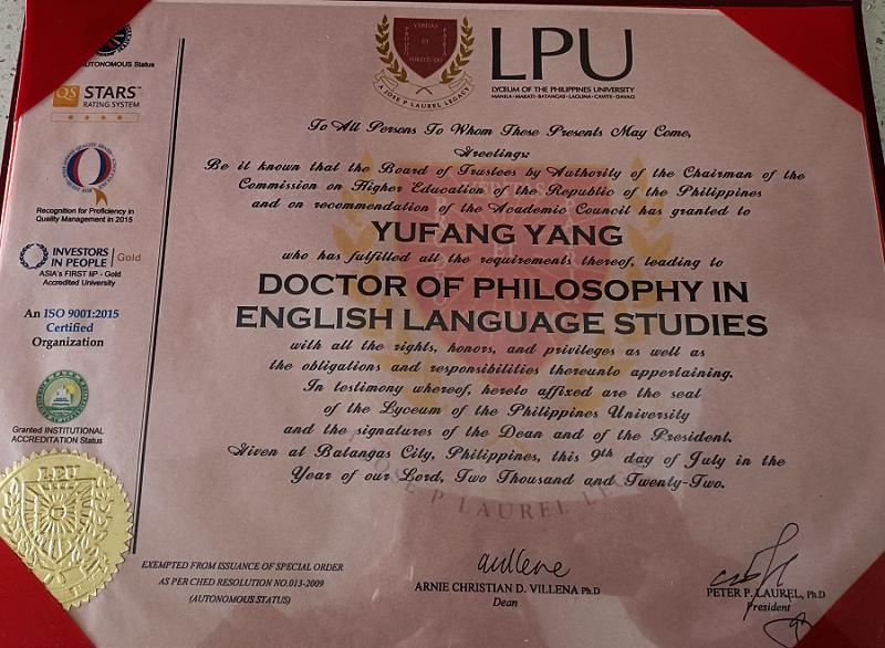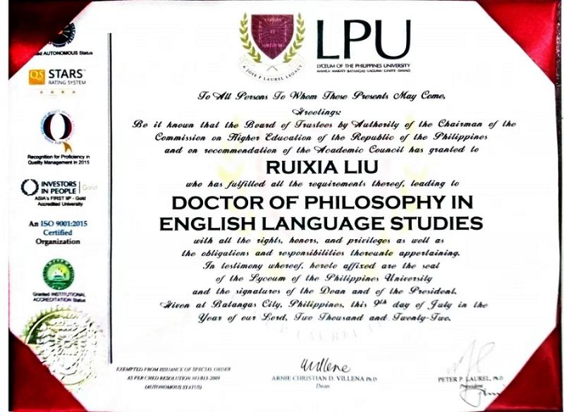 tyc86太阳集团教师刘瑞霞、杨玉芳于2020年05月-2022年11月在菲律宾莱西姆大学完成博士学业,顺利完成博士论文答辩,获得英语语言文学博士学位。两位教师博士学位的获得进一步提升了tyc86太阳集团教师的学历层次、科研能力。目前,tyc86太阳集团已有6名教师取得博士学位返校上岗。