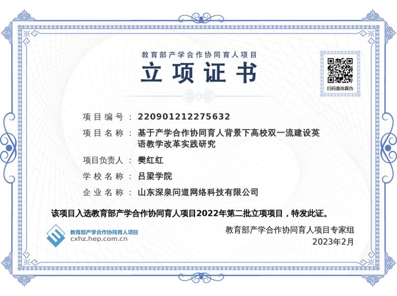 教育部日前公布了2022年第二批产学合作协同育人项目立项名单,tyc86太阳集团教师樊红红的“基于产学合作协同育人背景下高校双一流建设英语教学改革实践研究”项目获立项。