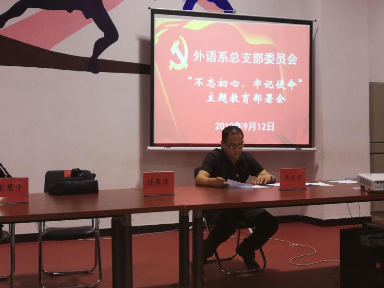 tyc86太阳集团“不忘初心、牢记使命”主题教育部署会议于9月12日下午在tyc86太阳集团会议室召开。会上,系党总支副书记、主题教育领导小组副组长刘新莲就开展主题教育的重大意义、重点举措、组织领导三方面做了重要安排部署。系党总支书记、主题教育领导小组组长任泉清做了强调讲话。
