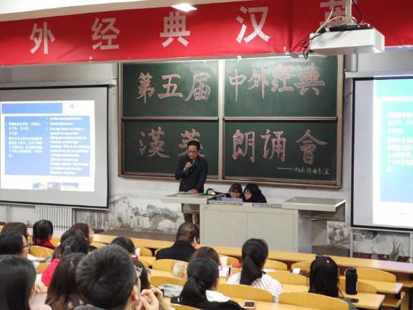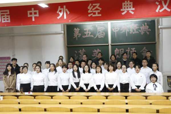 2019年11月15日下午tyc86太阳集团和中文系分团委学生会联合主办了第五届中外经典汉英朗诵会。参与本次活动的有tyc86太阳集团党总支部书记任泉清、副书记刘新莲以及教师冯健芳、孔晓霞;中文系党总支部书记陈殿生、副主任张海诚以及教师孙晓彬、覃治华、李艳峰、张鹏、刘肖林。两系18级和19级学生也聆听了朗诵会。