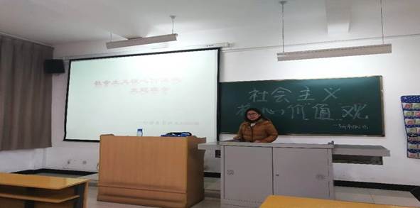 活动开始,团支书李倩对社会主义核心价值观做了基本阐述,班主任组织同学们深入学习讨论了社会主义核心价值观的主要内容,同学们积极参与,并分享了与社会主义核心价值观相联系的事迹。活动最后,大家一致表示要把社会主义核心价值观的学习融入到学习中、生活中、实践中,共同学习,共同进步。