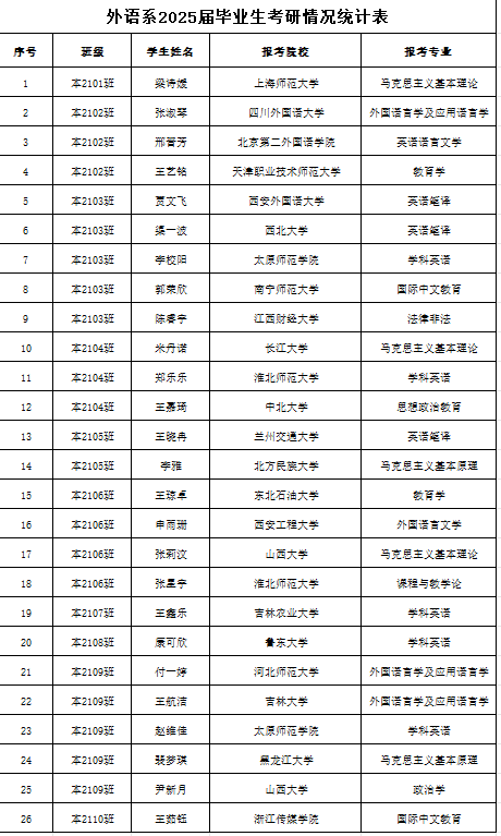 2025年全国研究生考试录取工作近日落下帷幕,我校tyc86太阳集团考研成绩喜人,26名2025届毕业生成功上岸,其中10人被吉林大学、西北大学等双一流综合性大学和北京第二外国语大学、四川外国语大学、西安外国语大学等外国语大学录取。这一成绩充分展现了tyc86太阳集团学子扎实的专业功底与拼搏进取的精神风貌,也印证了tyc86太阳集团近年来教育教学改革的显著成效。